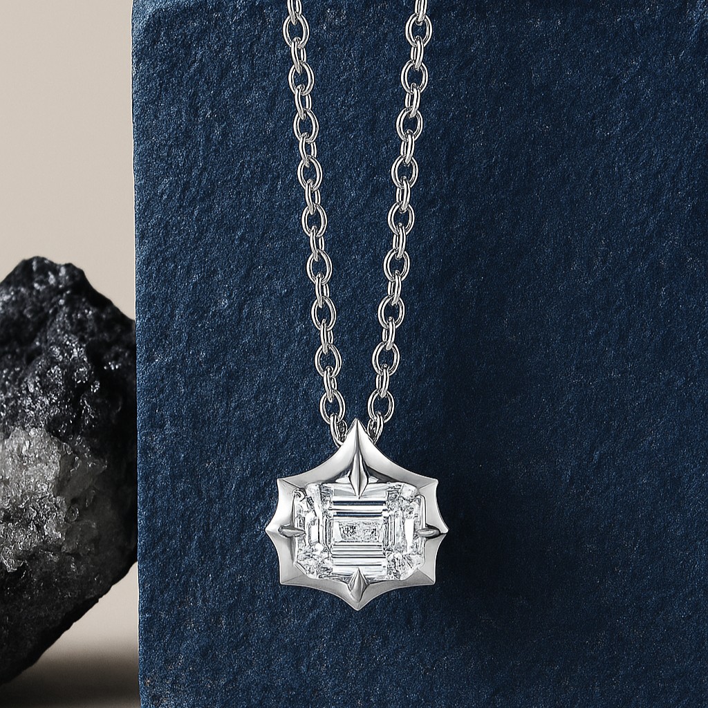 The Starlight Geometry Pendant is a radiant statement of refined grace. At its heart lies a perfectly cut emerald diamond, its sharp lines softened by a star-shaped frame that glows with modern elegance. Suspended from a delicate chain, the pendant captures light with every movement, offering a quiet brilliance that feels timeless yet strikingly contemporary. Available in white, rose, and yellow gold, it becomes a versatile treasure for both day and evening wear.