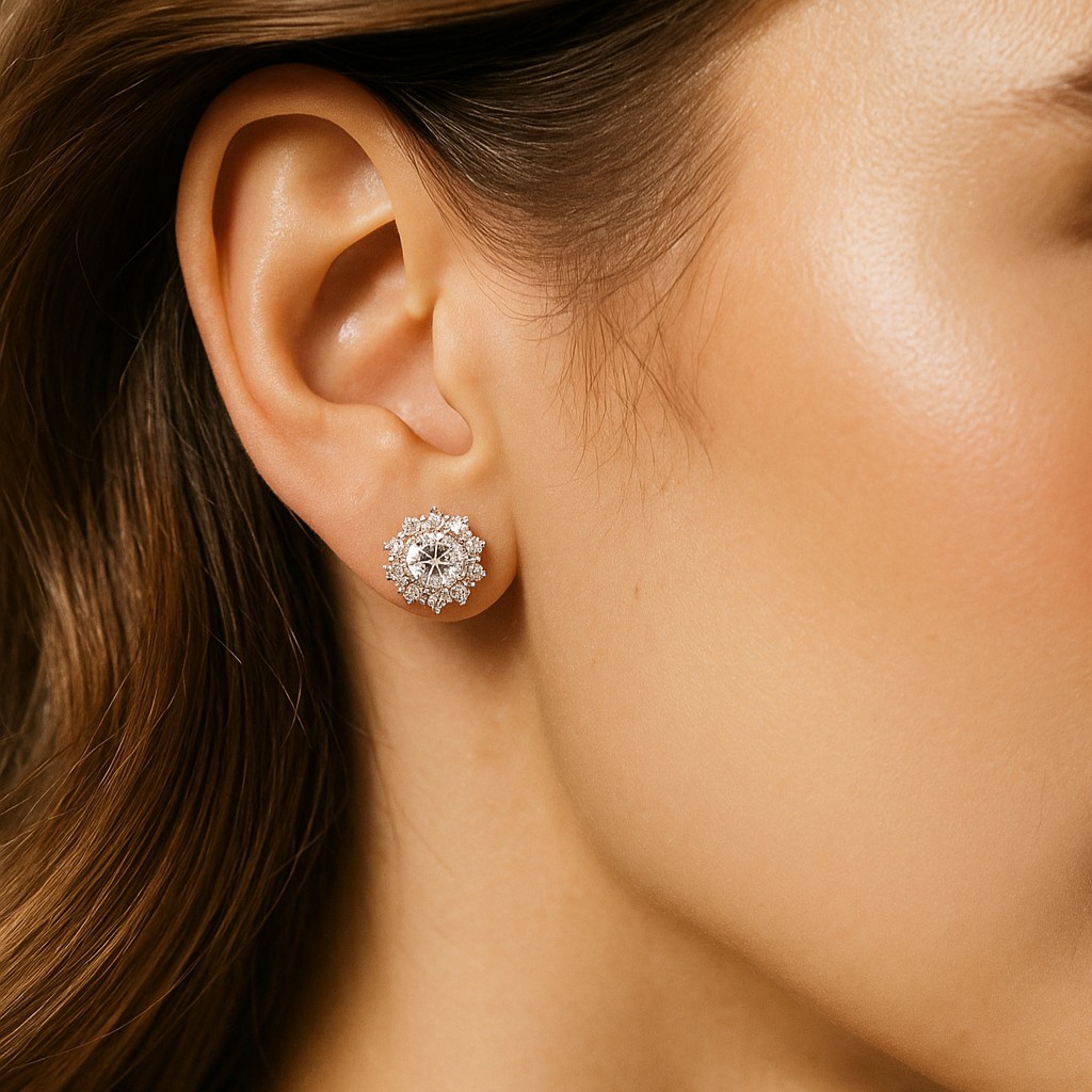 • These earrings are an ode to the eternal stars, capturing their endless shimmer and captivating glow. Each stud features a round-cut diamond encircled by a radiant burst of pavé-set diamonds, resembling the corona of light surrounding a star at its most brilliant. Crafted in 18k white gold, they are versatile yet statement-making—perfectly balancing refinement and a sense of cosmic wonder.