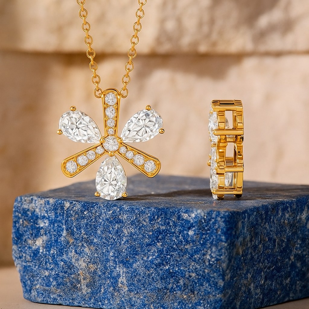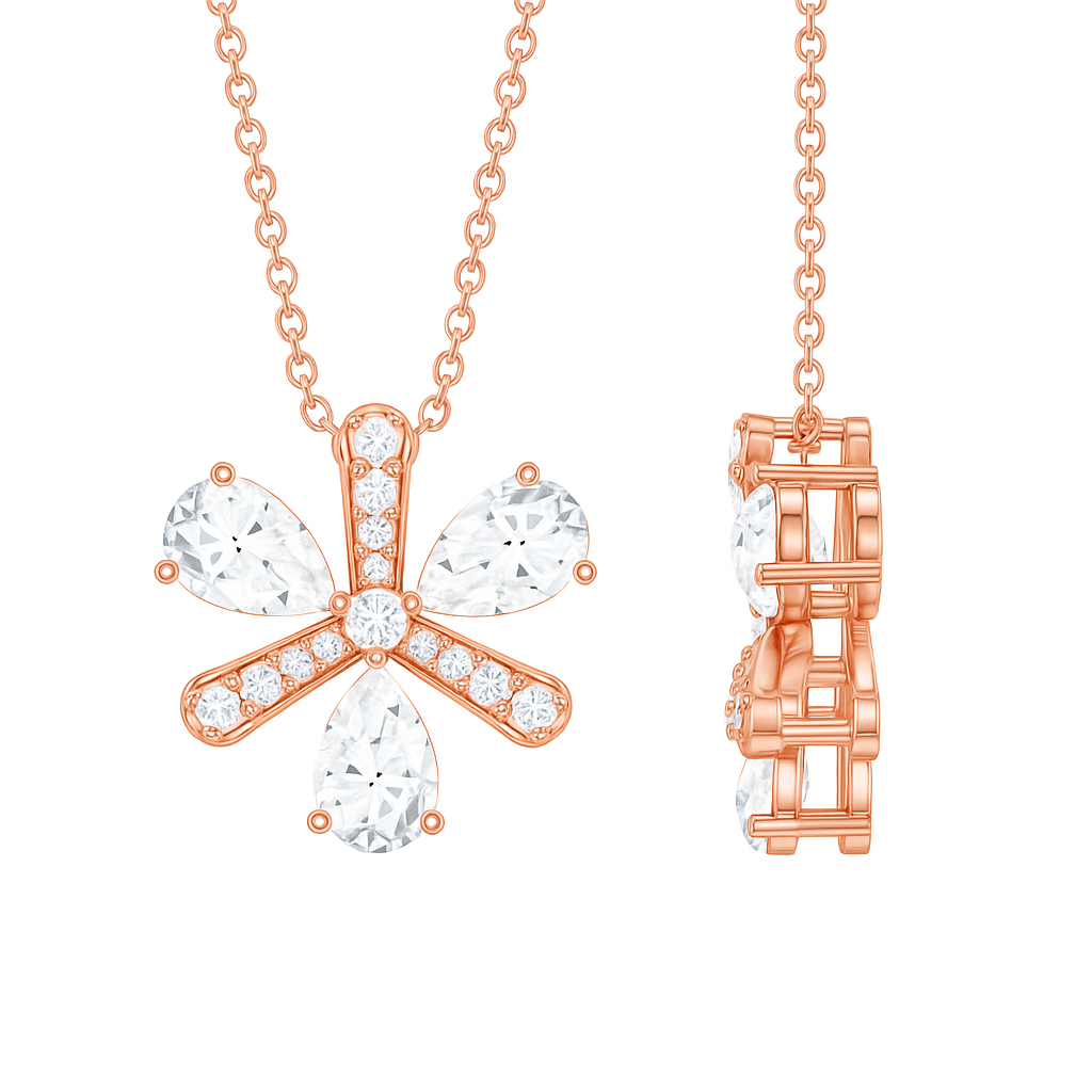 • Four diamond petals, delicately outlined with VS1 pavé brilliance, converge at a radiant core. The floral geometry captures nature’s effortless beauty, evoking spring blossoms kissed by morning light. A pendant for those who bloom wherever life plants them