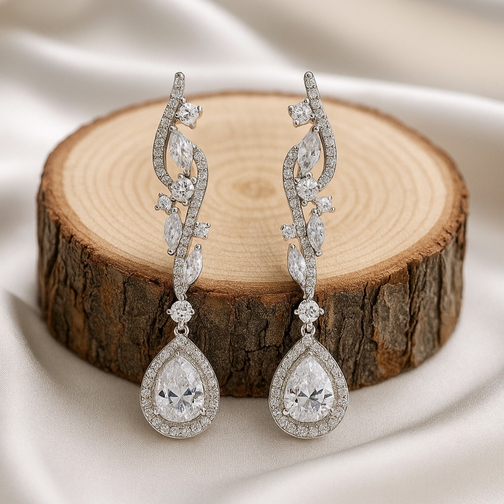 • Delicate yet commanding, these drop earrings feature cascading streams of marquise and round diamonds, flowing into a pear-shaped brilliance framed by a diamond halo. Designed in 18k white gold, the earrings shimmer with celestial fluidity, swaying like falling stars with every movement. They are the perfect embodiment of refined luxury — luminous, captivating, and endlessly graceful. The Celestial Cascade Collection