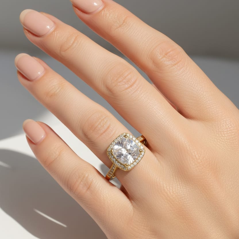 This exquisite ring frames a radiant emerald-cut centerpiece with a halo of delicate pavé-set stones, mounted on a luminous gold band lined with shimmering brilliance. The bold geometry of the emerald cut, softened by the surrounding halo, creates a perfect harmony of strength and femininity. Wear it as a promise, a statement, or a legacy — a ring that feels both modern and eternal.
