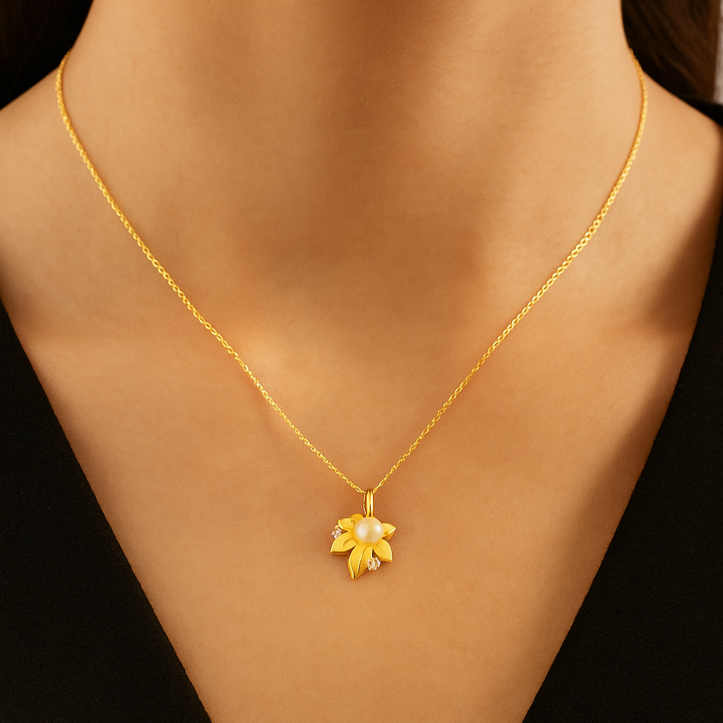 • At the heart of this delicate design is a lustrous freshwater pearl, its smooth surface reflecting light like a hidden gem waiting to be discovered. The pearl is surrounded by meticulously set VS1 diamonds—each one shimmering with a clarity that rivals the brightest stars in the night sky. The diamonds, though small, sparkle with an elegance that gives the pendant its extraordinary charm.