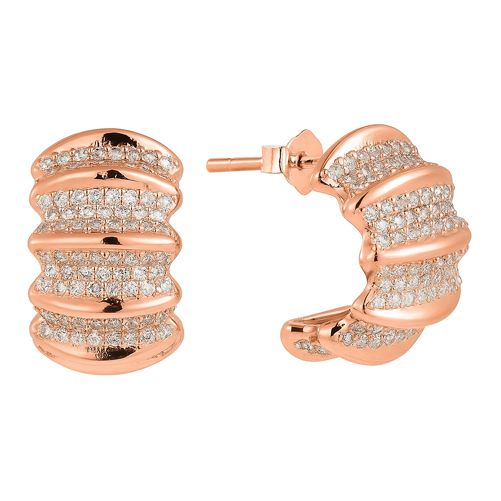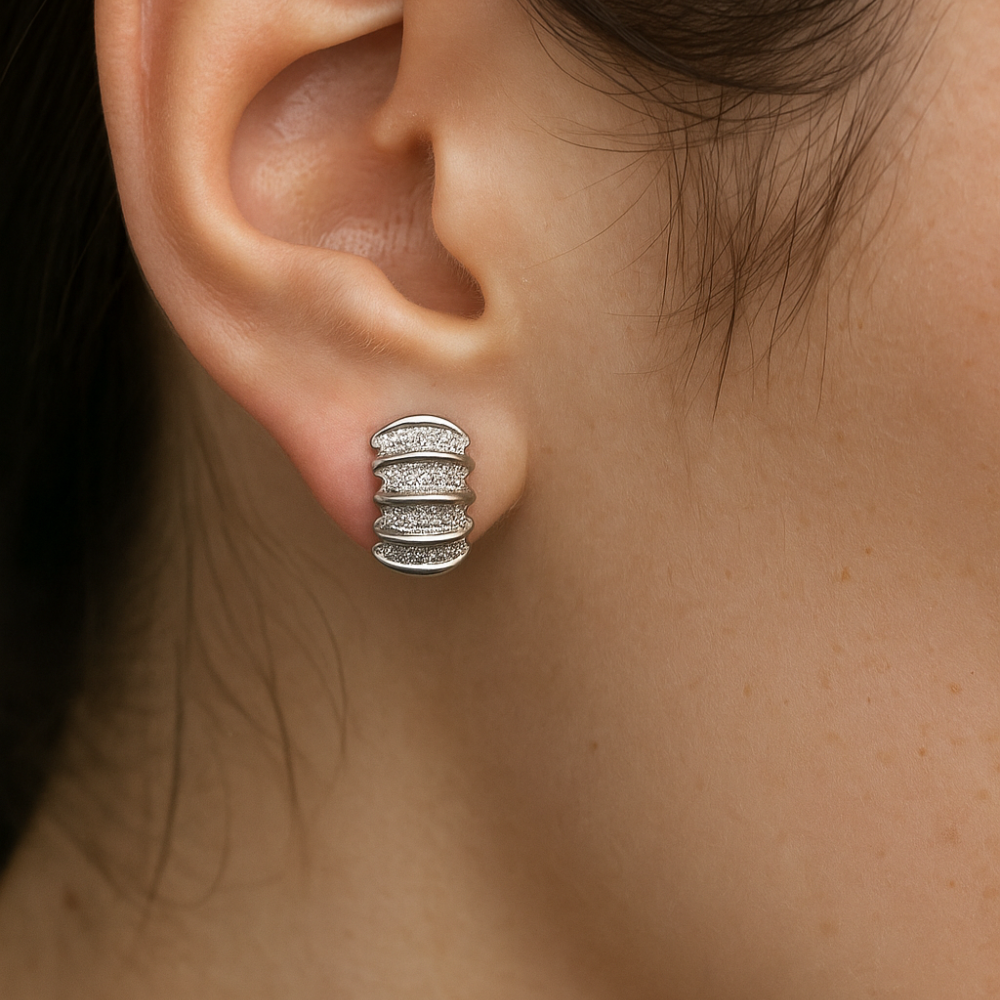 Graceful ridges of gold ripple across these earrings, accented with rows of pavé diamonds that shimmer like sunlight dancing on the ocean’s waves. A balance of strength and elegance, these earrings capture the rhythm of eternity, evoking both serenity and power in a design that never ceases to mesmerize.